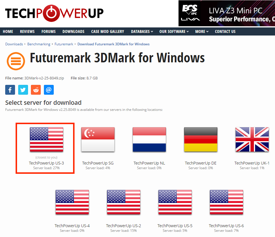 Futuremark 3DMark for Wondows 다운로드 서버를 선택해주어야 합니다.